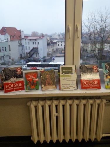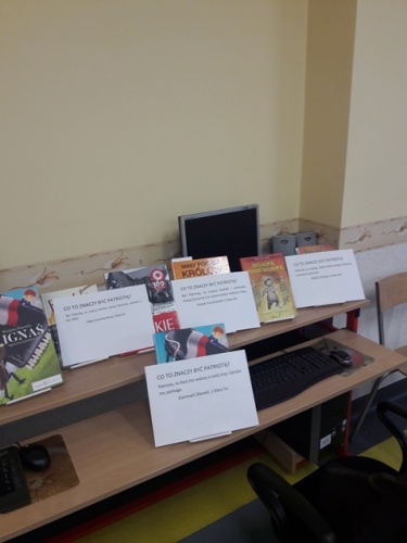 W tym dniu w naszej bibliotece zaprezentowana została wystawa książek patriotycznych a także wypowiedzi pisemne uczniów klasy IVA, VA i VE pt.:"Co to znaczy być patriotą?"