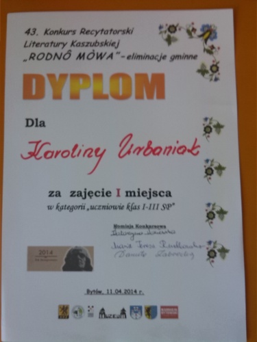 Dnia 11 kwietnia 2014r.w Bytowskim Centrum Kultury odbył się 43 konkurs recytatorski literatury kaszubskiej na szczeblu gminnym. W eliminacjach wzięli udział uczniowie naszej szkoły: Karolina Urbaniak kl.3f, Oliwia Stolc kl.3f i Bartosz Koszela kl.3f. Jury konkursu przyznało pierwsze miejsce w kategorii klas I-III Karolinie Urbaniak kl.3f, która będzie reprezentowała Gminę Bytóww eliminacjach konkursu na szczeblu powiatowym.