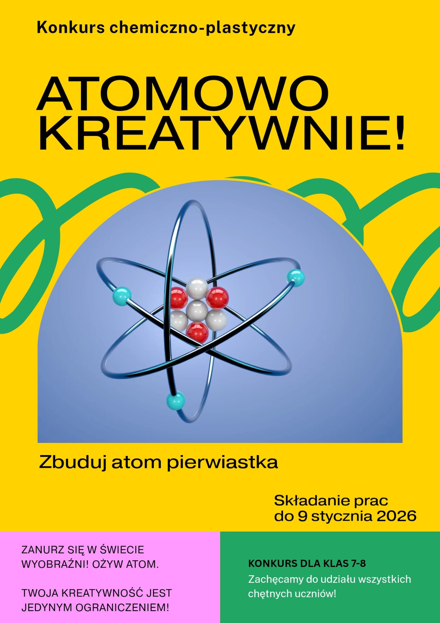 - Poprawność chemiczną i zgodność z tematyką – czy to faktycznie atom, a nie np. UFO. - Kreatywność – im bardziej oryginalnie, tym lepiej! - Kompozycję i formę - Estetykę – czyli czy jest po prostu ładny, czysty i starannie wykonany. Prace należy składać do 9 stycznia 2026 r. u p. Joanny Flor lub p. Alicji Breske. Wyniki: 16 stycznia 2026 r. Laureaci wybrani przez komisję konkursową otrzymają atrakcyjne nagrody rzeczowe, dyplomy, ocenę na nowe półrocze. Prace nie będą zwracane. Model zostanie w szkole jako pamiątka Twojego chemicznego geniuszu. Organizatorzy: Joanna Flor, Alicja Breske |