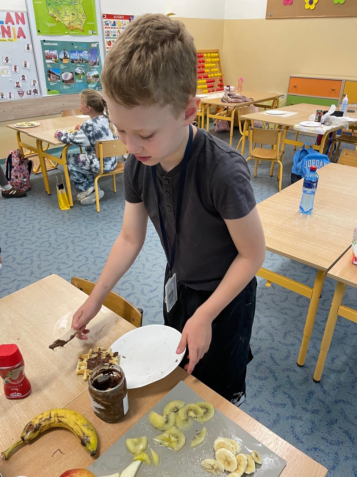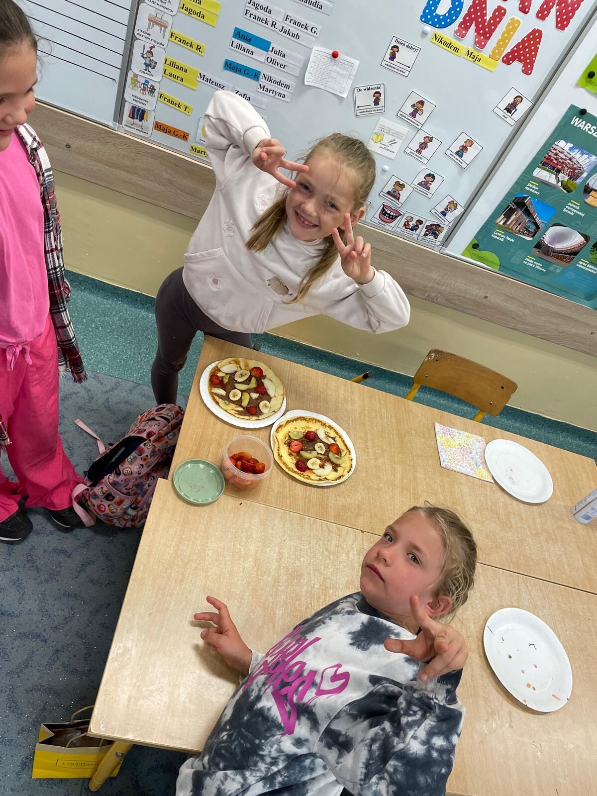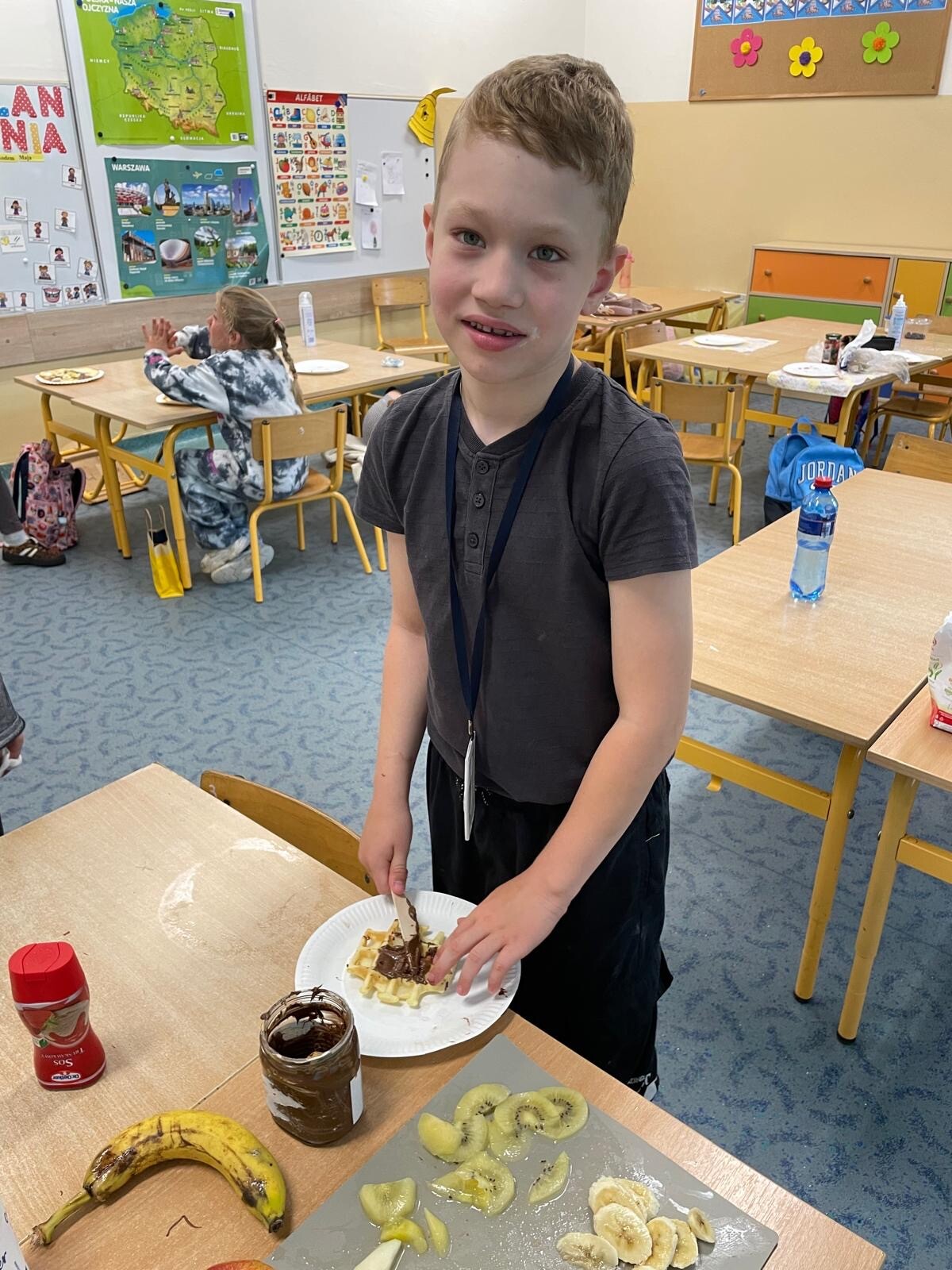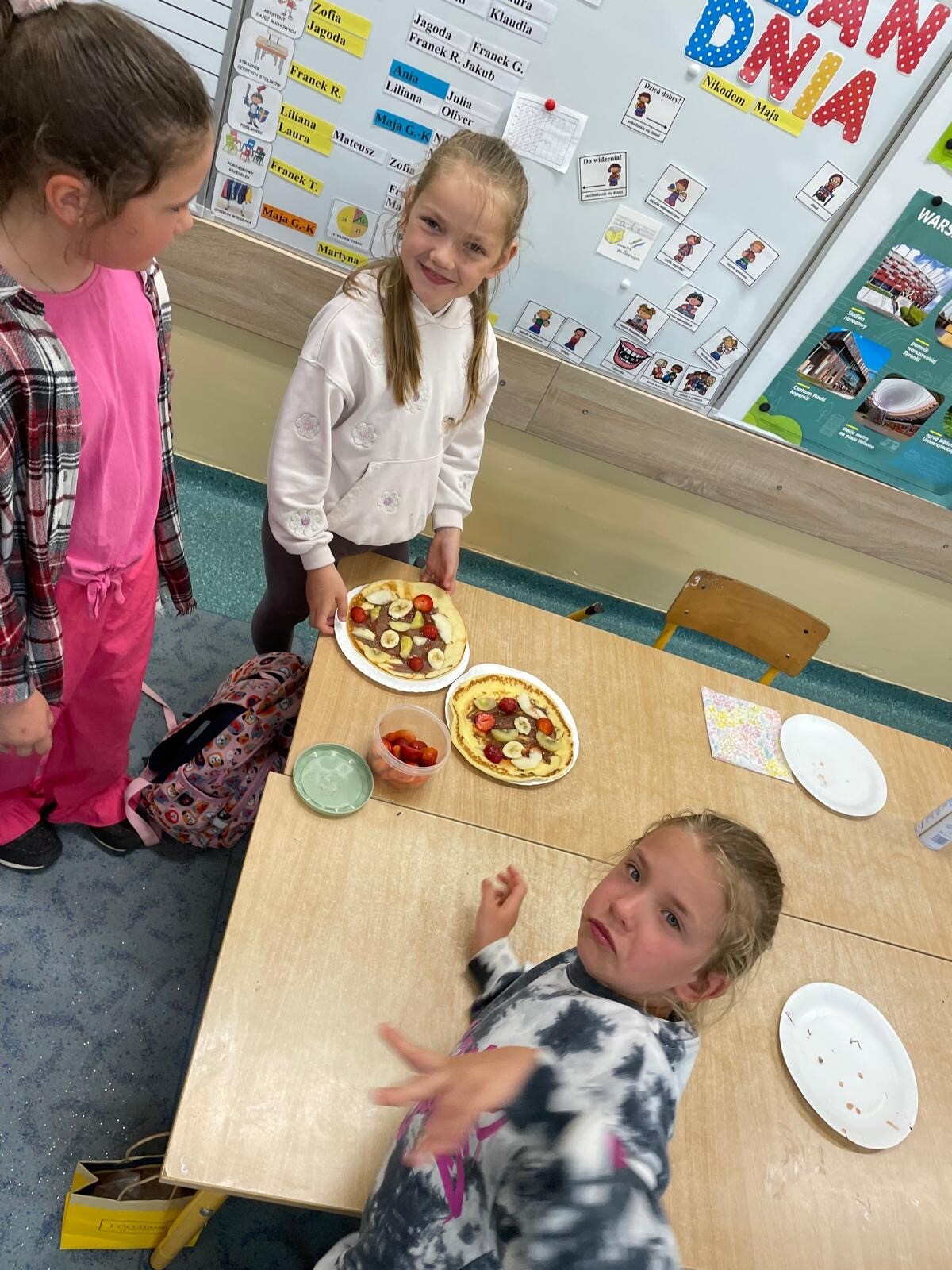 Dziś w klasie 1d unosiły się zapachy, od których każdy łasuch poczułby szybsze bicie serca. Uczniowie zamienili się w mistrzów patelni i gofrownic — na stołach pojawiły się naleśniki, gofry, a na nich prawdziwe cuda: dżemy, czekolada, owoce i... szczypta radości!Było pysznie, słodko i wesoło, a uśmiechy dzieci mówiły jedno: "Możemy to robić codziennie?"