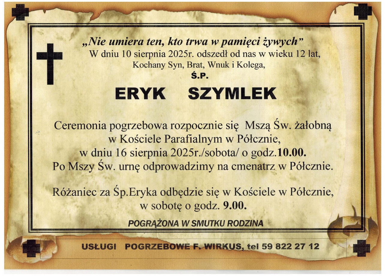 Z wielkim smutkiem przyjęliśmy wiadomość o śmierci ucznia naszej szkoły Eryka Szymlek z klasy 5a.