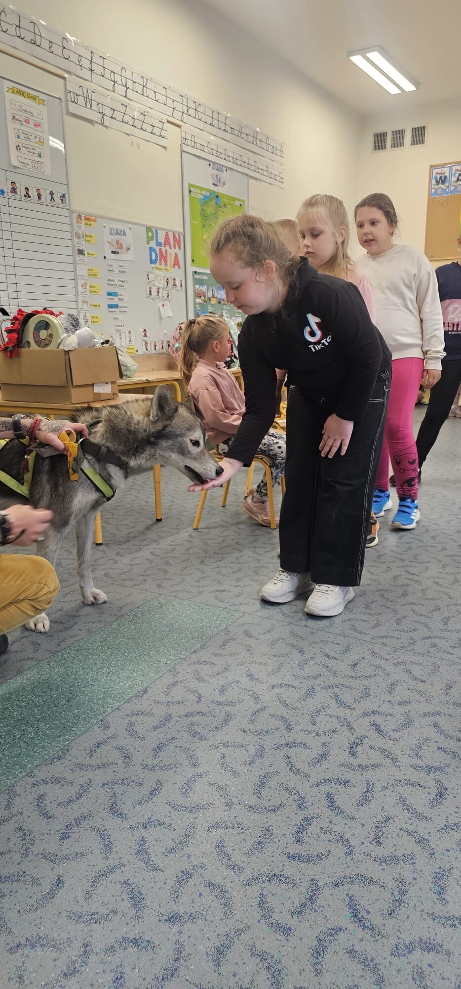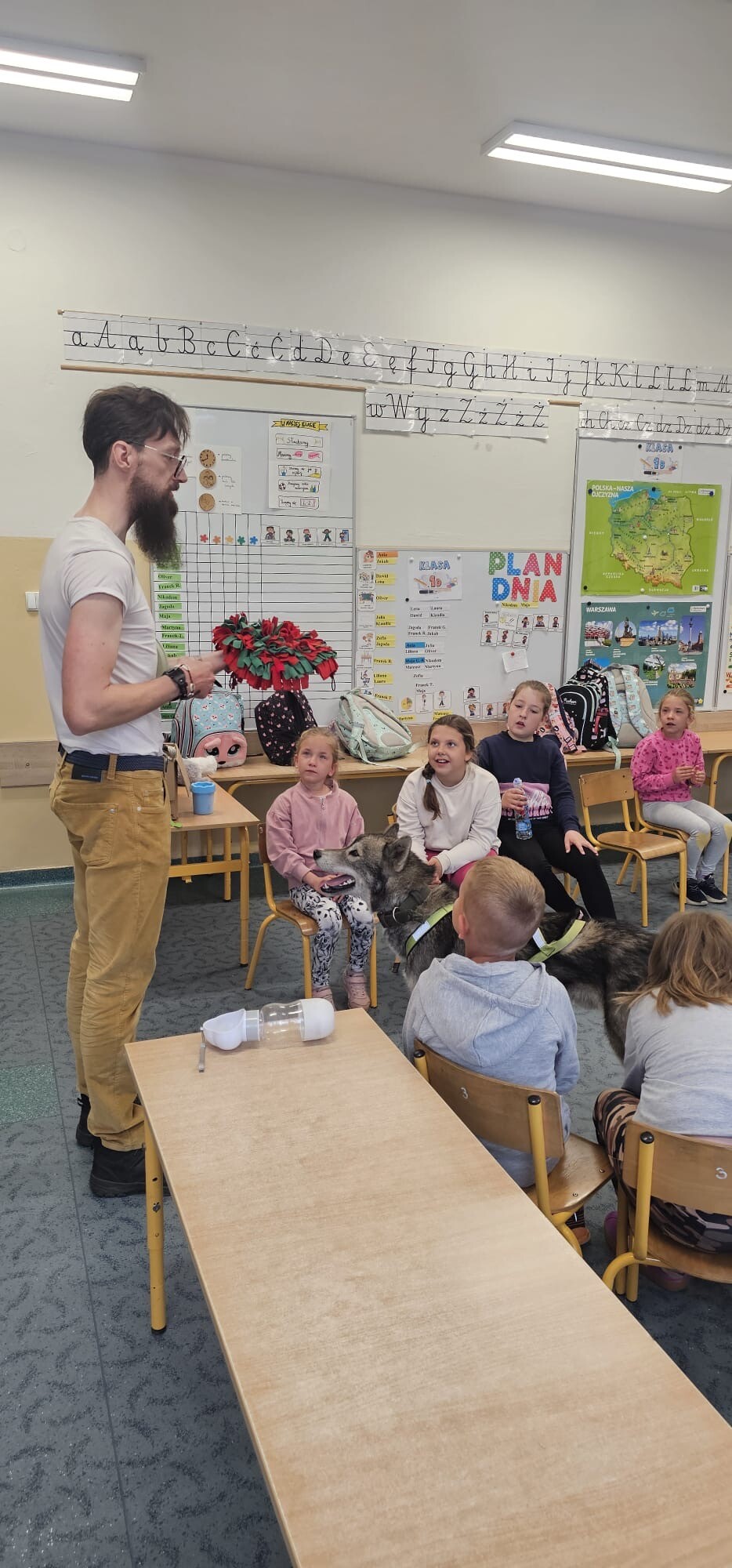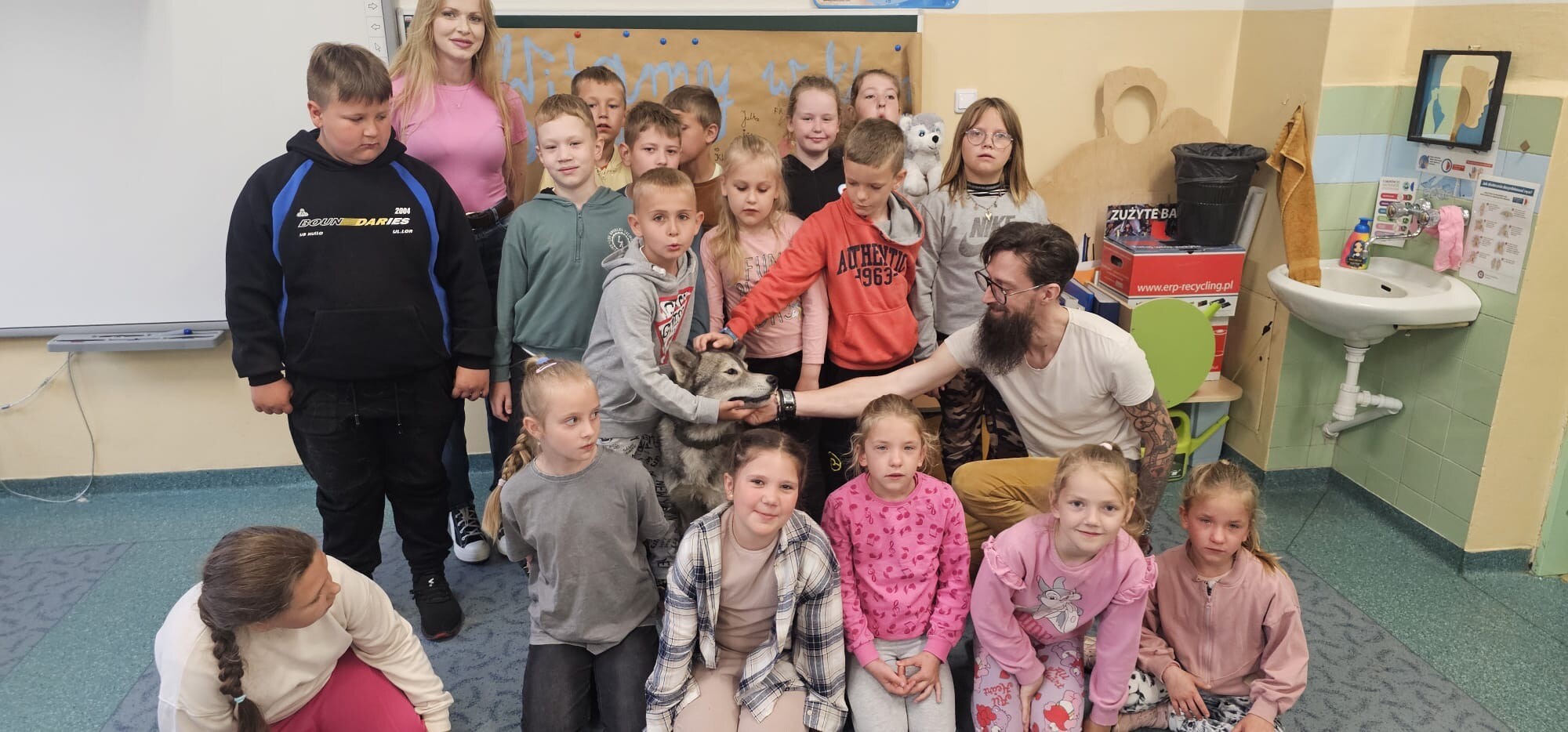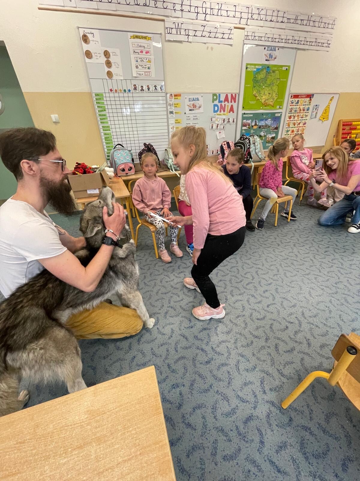 Dziś klasa 1D spotkała niezwykłego gościa — cudownego psa rasy Syberian Husky, który wprowadził nas w świat dogoterapii! Były przytulasy, głaskanie, ćwiczenia zaufania i mnóstwo radości - a wszystko pod czujnym, błękitnym spojrzeniem naszego futrzastego terapeuty. Okazuje się, że najlepsi nauczyciele mają cztery łapy i merdający ogon!