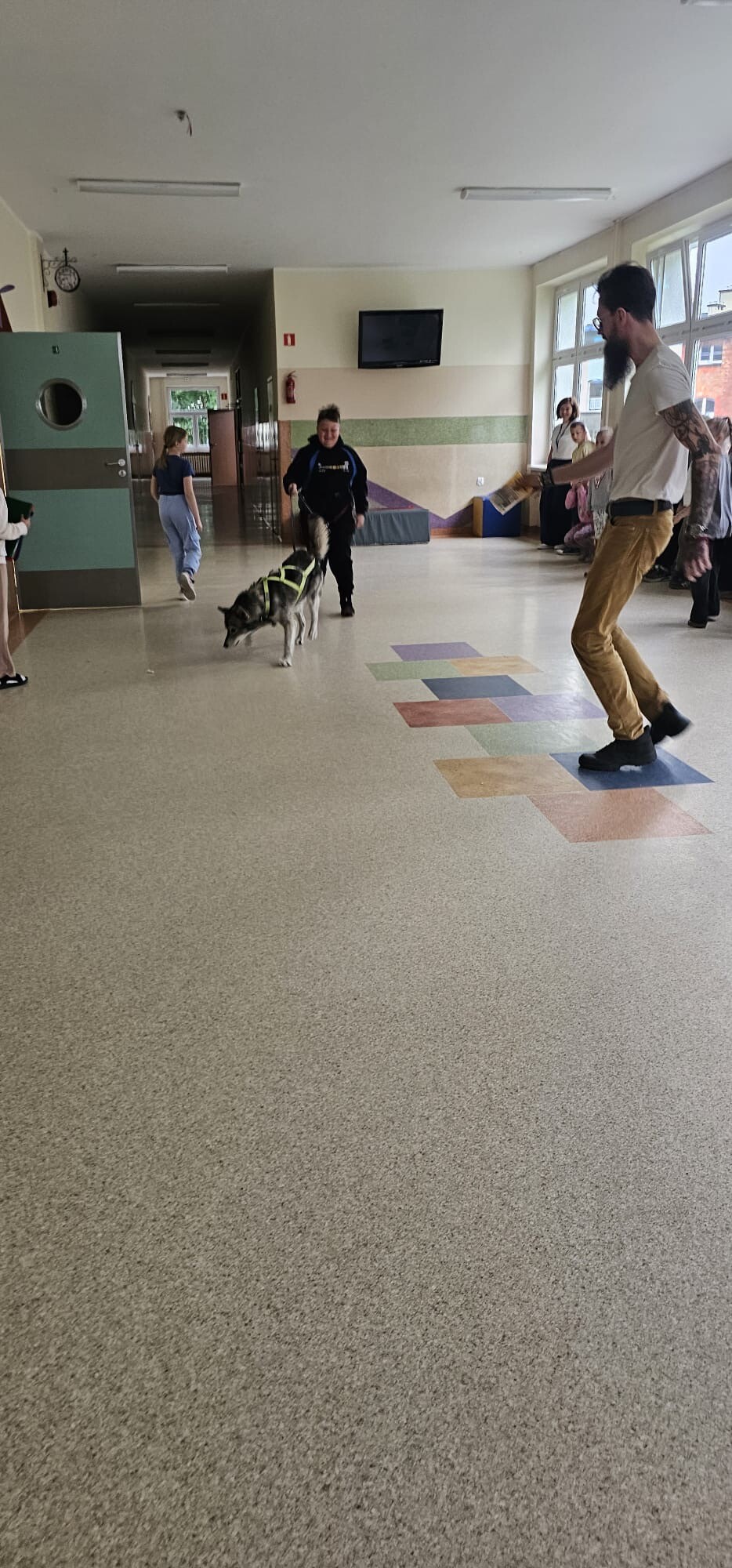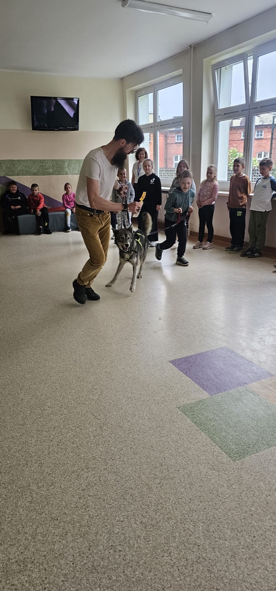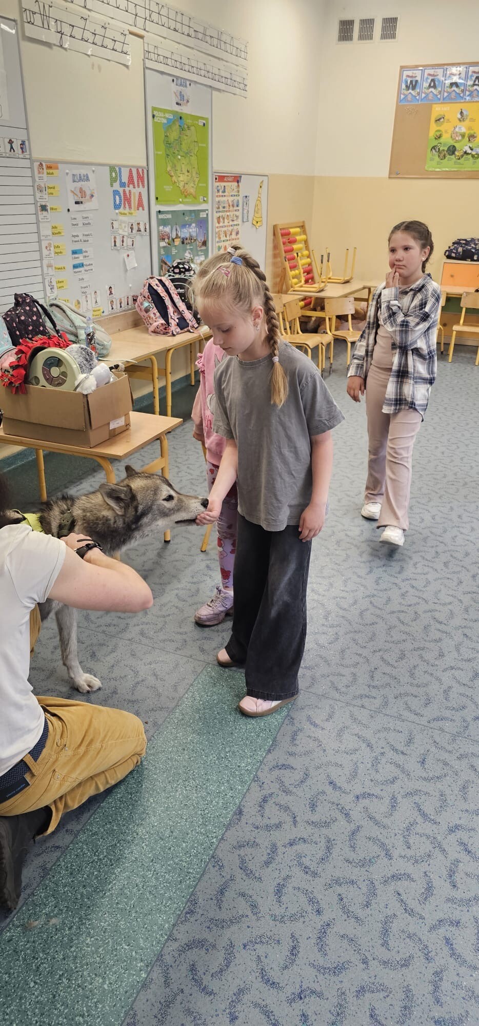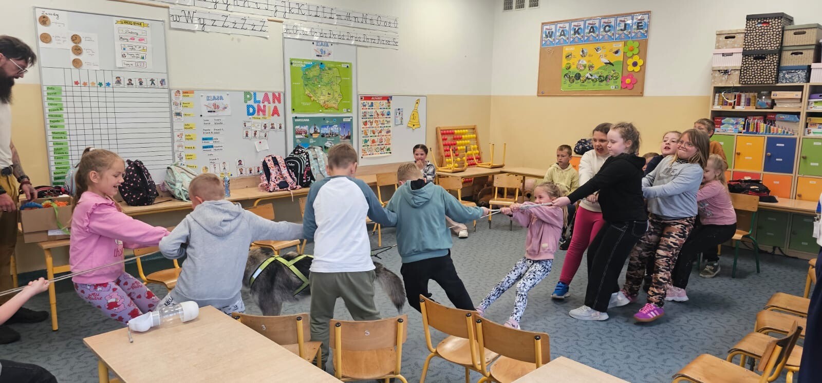 Dziś klasa 1D spotkała niezwykłego gościa — cudownego psa rasy Syberian Husky, który wprowadził nas w świat dogoterapii! Były przytulasy, głaskanie, ćwiczenia zaufania i mnóstwo radości - a wszystko pod czujnym, błękitnym spojrzeniem naszego futrzastego terapeuty. Okazuje się, że najlepsi nauczyciele mają cztery łapy i merdający ogon!