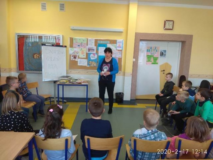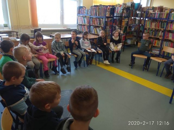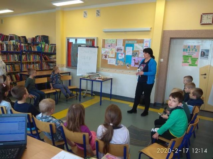 Z tej okazji biblioteka zorganizowała zajęcia czytelnicze, na które zaprosiła najmłodszych czytelników naszej biblioteki, klasę 1d. Dzieci na zajęcia przyniosły zdjęcia swoich kotów i kocie maskotki. Uczniowie bardzo chętnie opowiadali o swoich puszystych pupilach, o ich pielęgnacji, przyzwyczajeniach i o tym, jak wspaniale potrafią się z nimi bawić. Dzieci zostały zaproszone do udziału w konkursie plastycznym o kotach, wysłuchały wiersza J. Tuwima „Kotek”. Uczniom zostały zaprezentowane książki o kotach, które znajdują się w zbiorach naszej biblioteki. Dzieci zostały zachęcone także do czytania serii książek Waldemara Cichonia opisujących najbardziej niesfornego kota na świecie „Cukierku, ty łobuzie”. W czasie zajęć uczniowie wysłuchali piosenki „Wlazł kotek na płotek”, oraz bawiły się w zabawę ruchową „Uciekaj myszko do dziury”. Na zakończenie zajęć dzieci wysłuchały bajeczki Stanisława Jachowicza „Chory Kotek”.