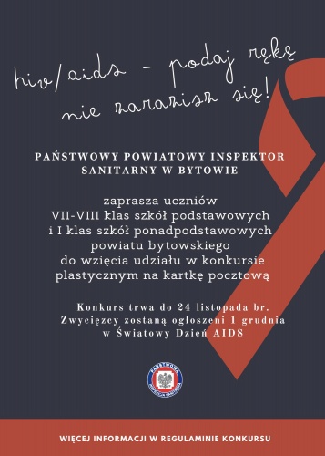 Państwowy Powiatowy Inspektor Sanitarny w Bytowie i Pomorska Biblioteka Pedagogiczna w Słupsku, filia w Bytowie zaprasza uczniów klas VII i VIII do udziału w powiatowym konkursie wiedzy o HIV/AIDS.