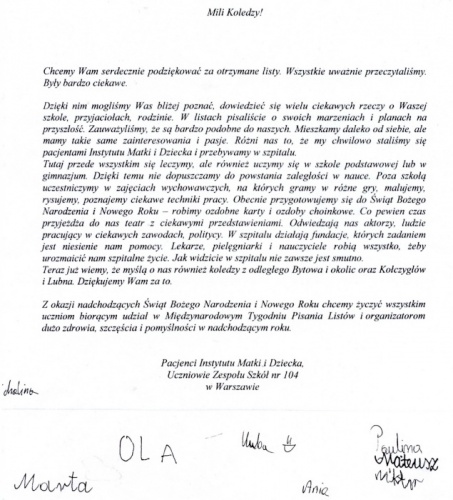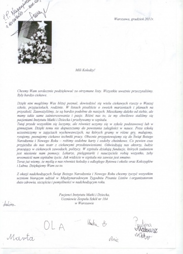 W październiku 2011 roku 29 uczniów z naszej szkoły wzięło udział w akcji pisania listów do chorych dzieci przebywających w Instytucie Matki i Dziecka w Warszawie.