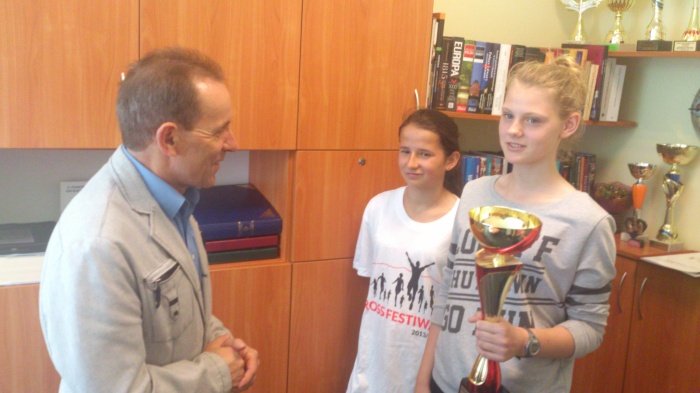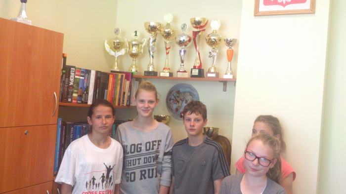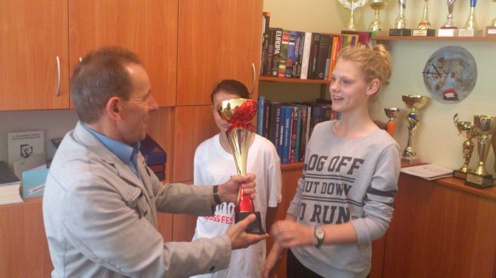 Na zdjęciu najlepsi biegacze u dyrektora szkoły mgr Jerzego Jobczyka.