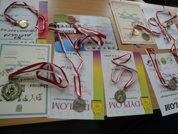 Nasz młody biegacz może pochwalić się 61 dyplomami,39 medalami i 6 pucharami. Posiada też flagę angielską, którą dostał na Mistrzostwach Świata w Sopocie.
