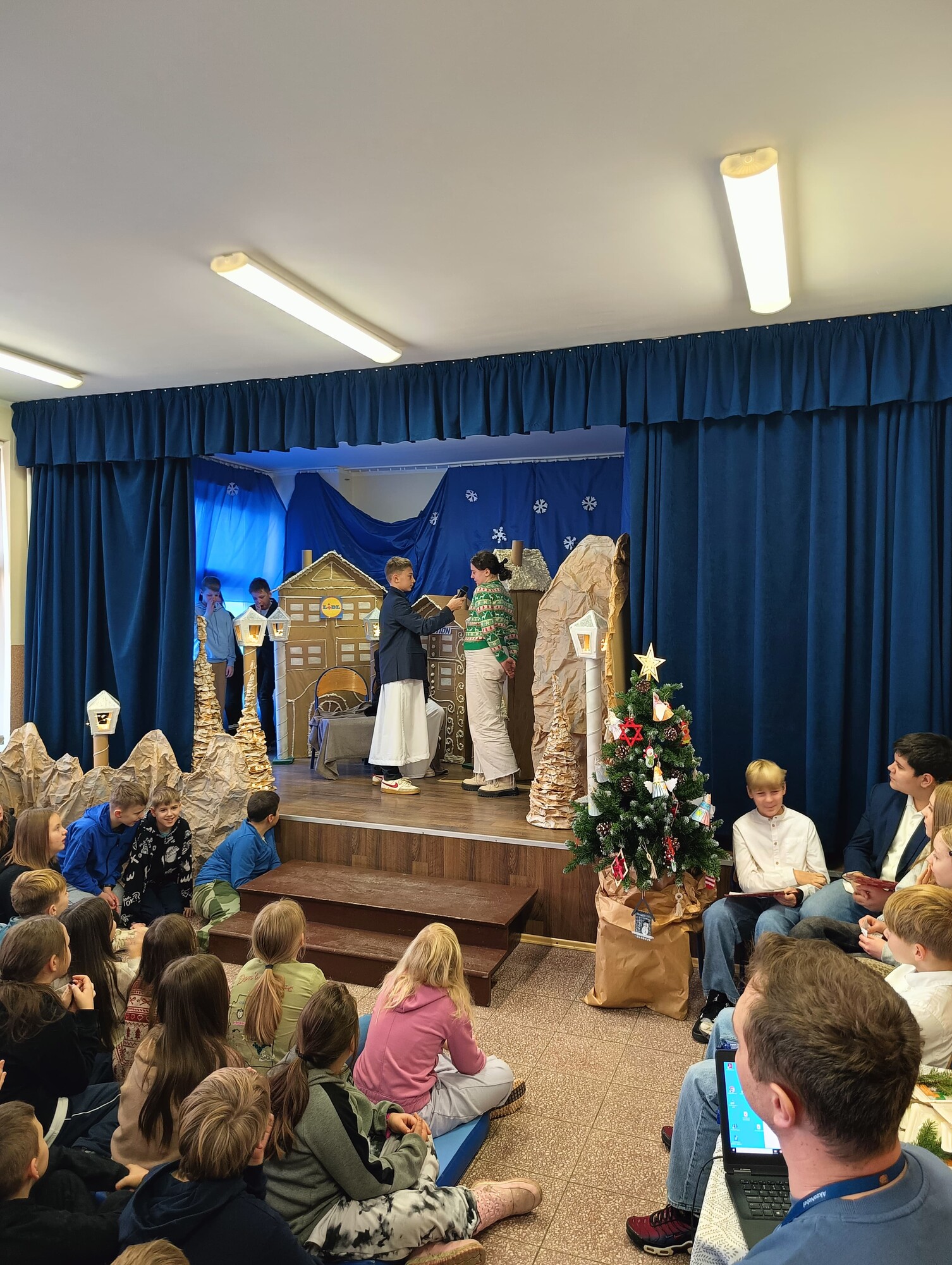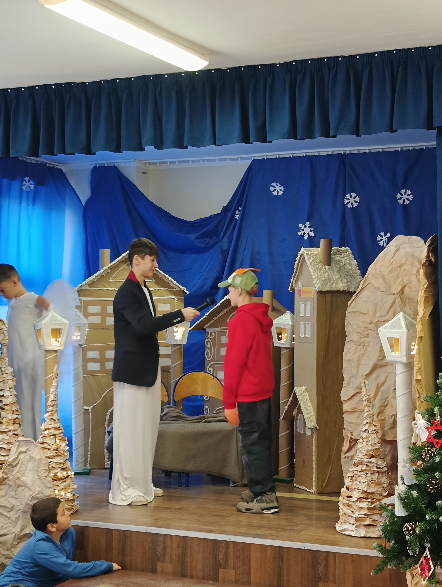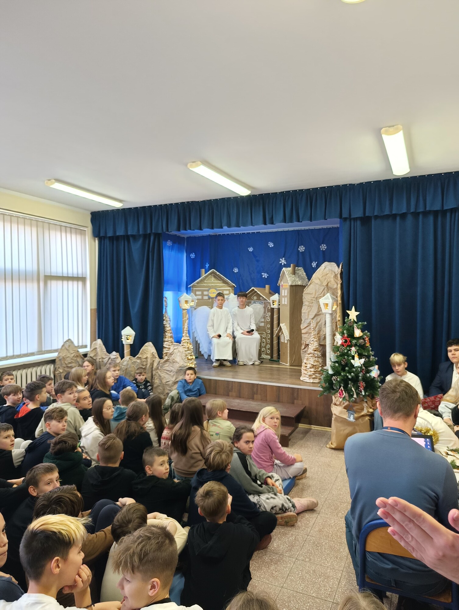 19 grudnia, z okazji zbliżających się Świąt Bożego Narodzenia, uczniowie klasy 6b wraz z wychowawczynią Moniką Gostomską oraz panią Kamillą Malską przygotowali wyjątkowe przedstawienie świąteczne pt. „Anielski kłopot”.