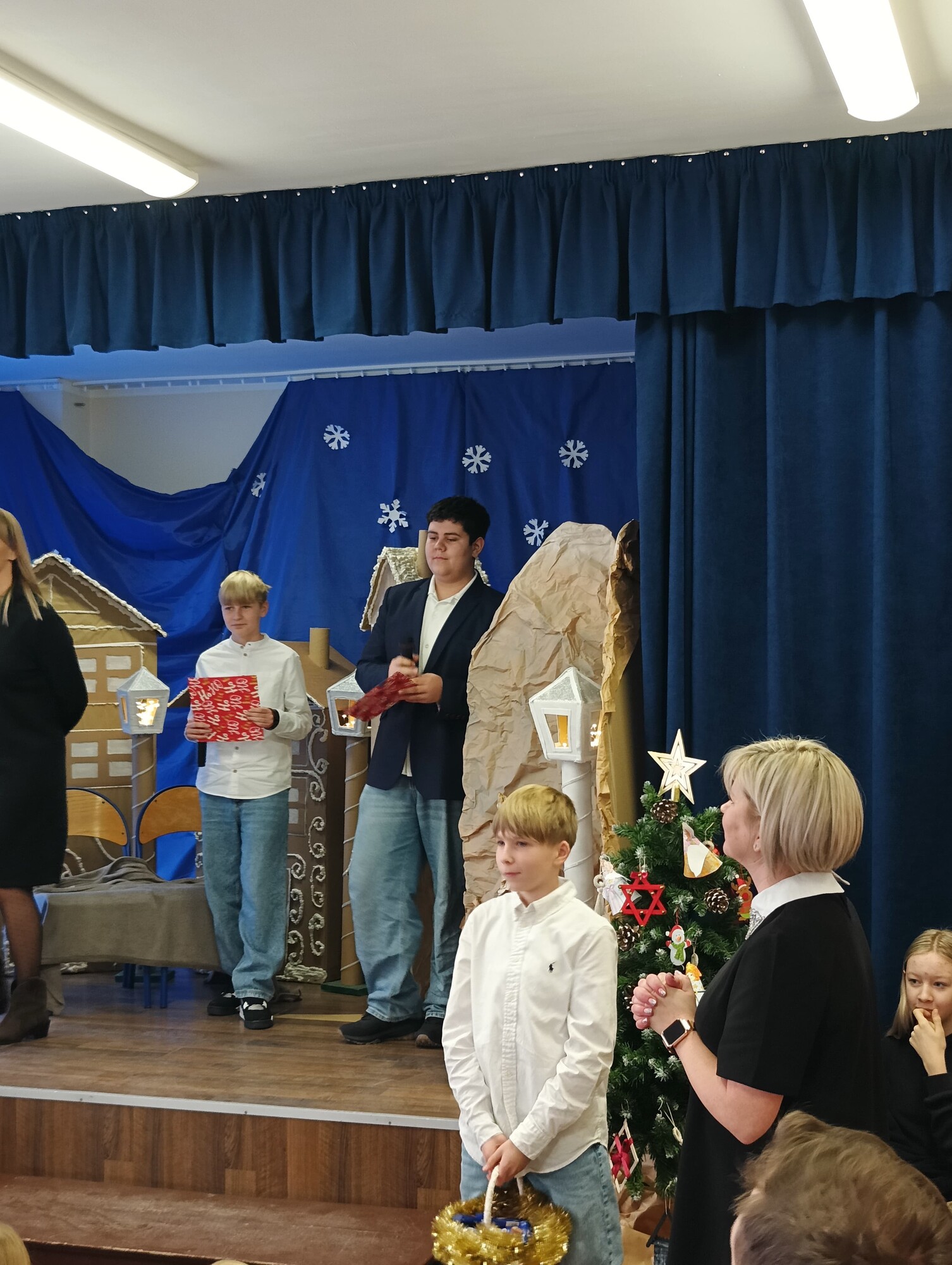O wspaniałe dekoracje zadbała pani Alicja Breske. Natomiast Stasiu Machut z klasy 8b oraz Antek Jachyra z klasy 6b przeprowadzili świąteczny quiz w języku angielskim pt. „How much do you know about Christmas?”.