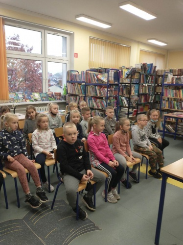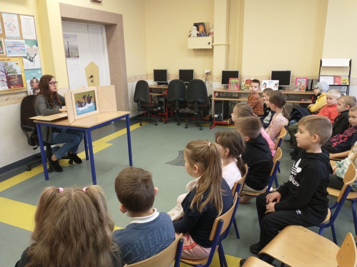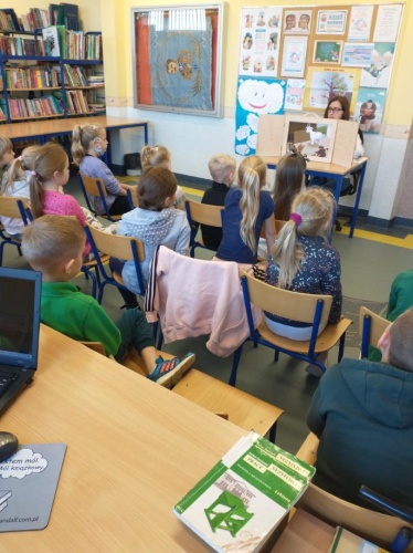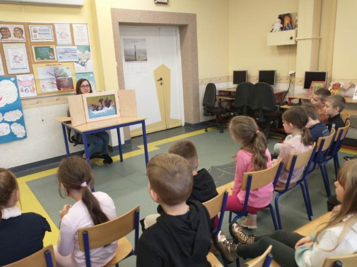 Z okazji obchodów Międzynarodowego Miesiąca Bibliotek Szkolnych, uczniowie klas pierwszych, obejrzeli w bibliotece szkolnej przedstawienie w teatrzyku Kamishibai.