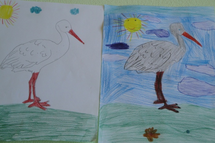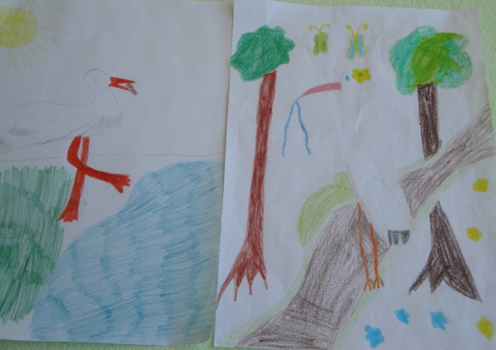 Po obejrzeniu prezentacji multimedialnej „Bociany” i wysłuchaniu fragmentów obu książek, Kajtka i Dziobasia narysowały:
