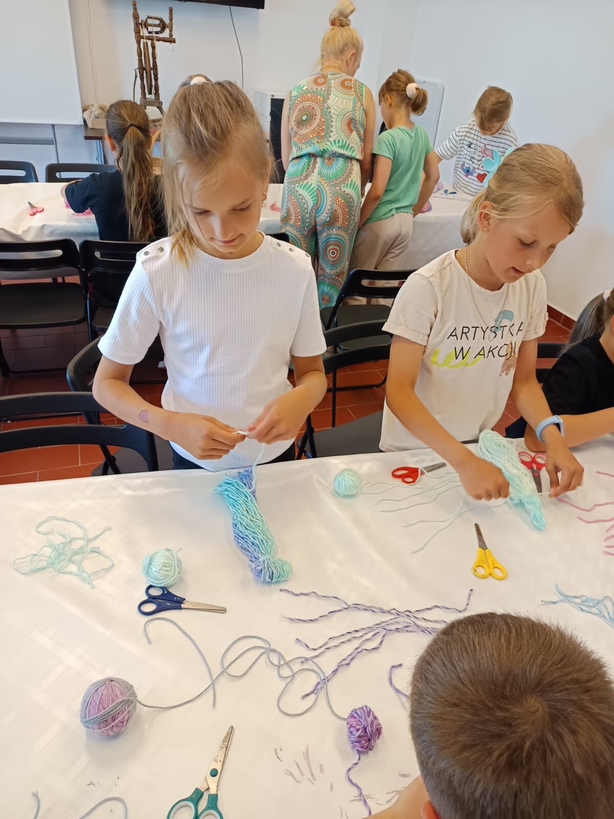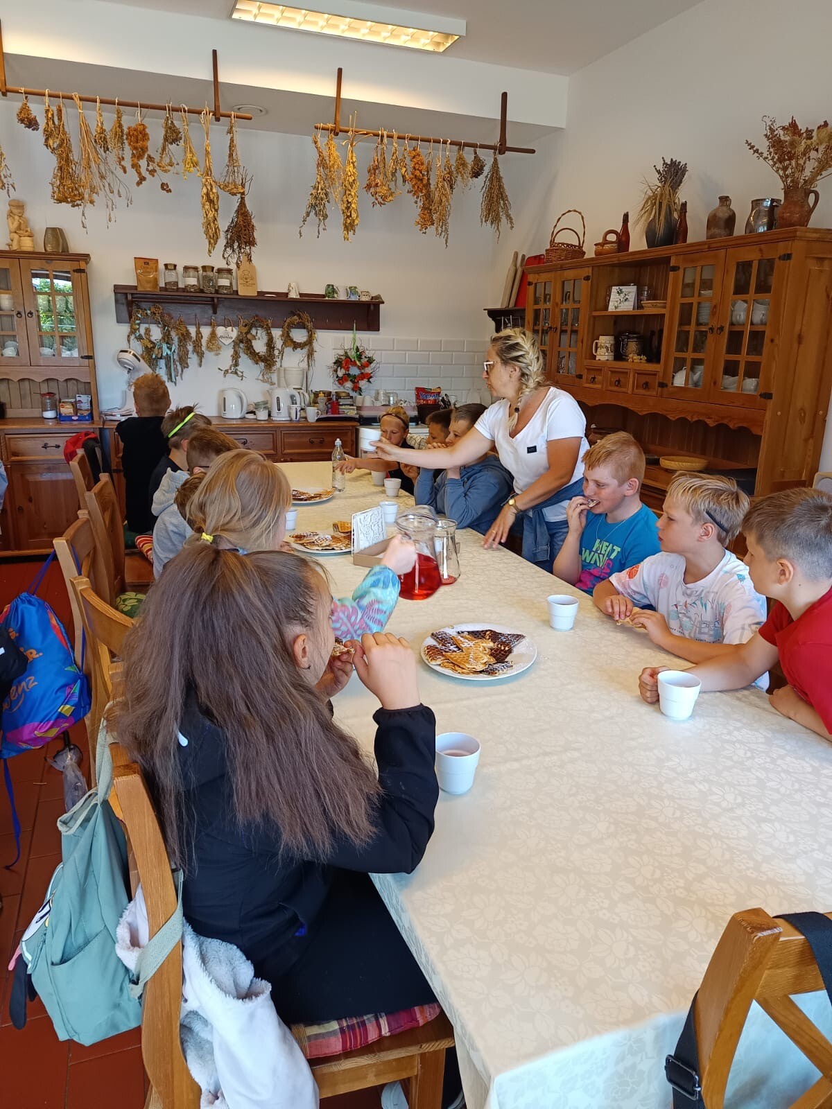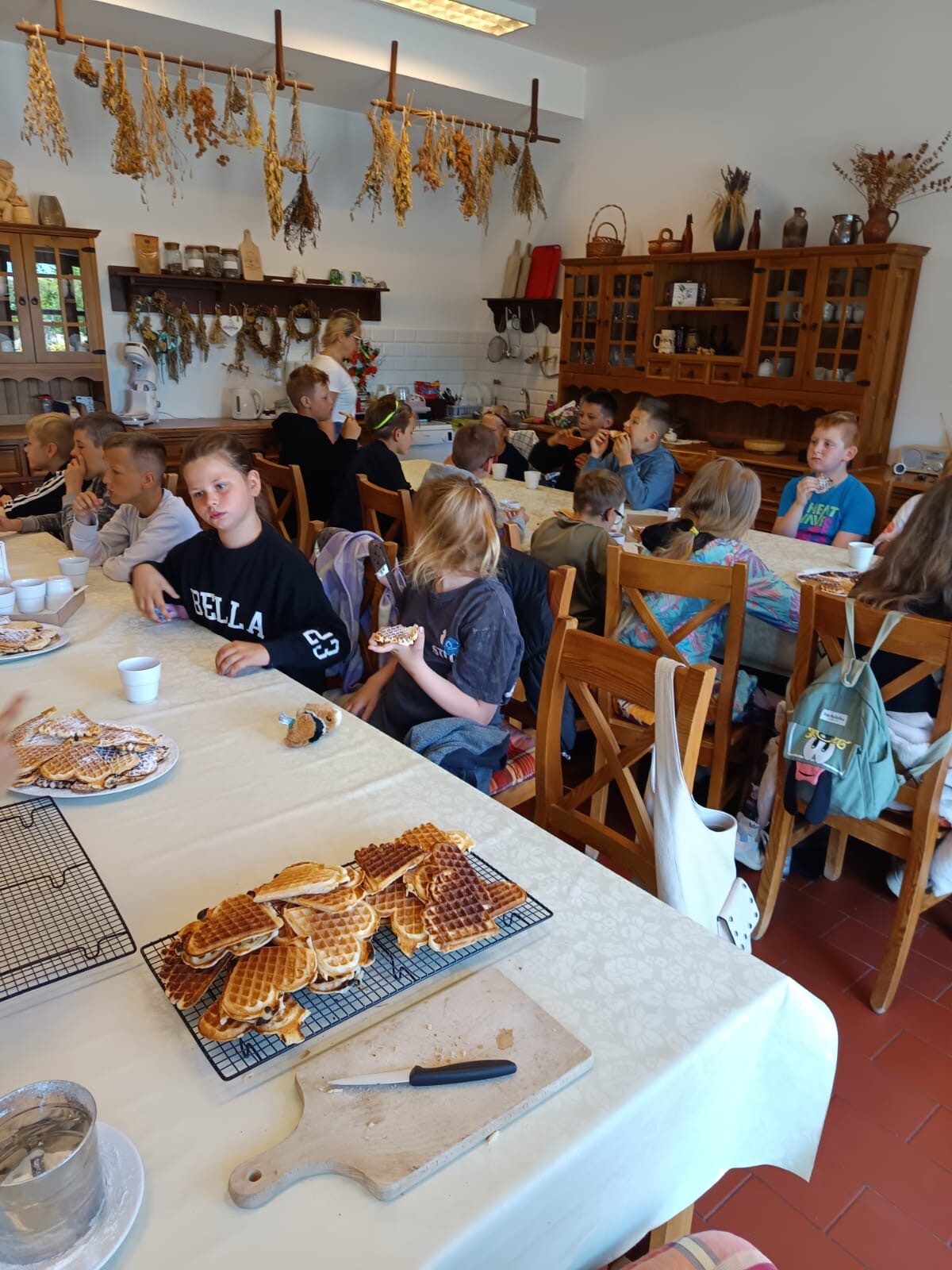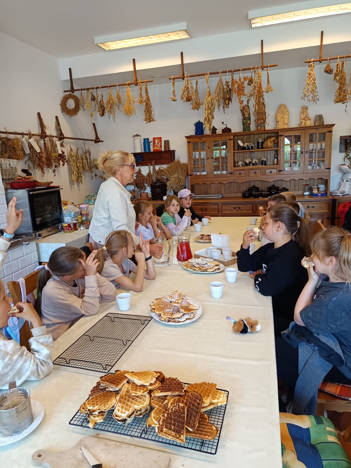 Następnie uczniowie udali się pieszo do Zagrody Styp-Rekowskich, gdzie czekały na nich ciepłe, chrupiące gofry wypiekane na tradycyjnym piecu kaflowym. Dzieci wzięły także udział w interesujących warsztatach edukacyjnych, podczas których poznały historię hodowli owiec na Kaszubach oraz własnoręcznie wykonały lalki z kolorowych gałganków i wełny.