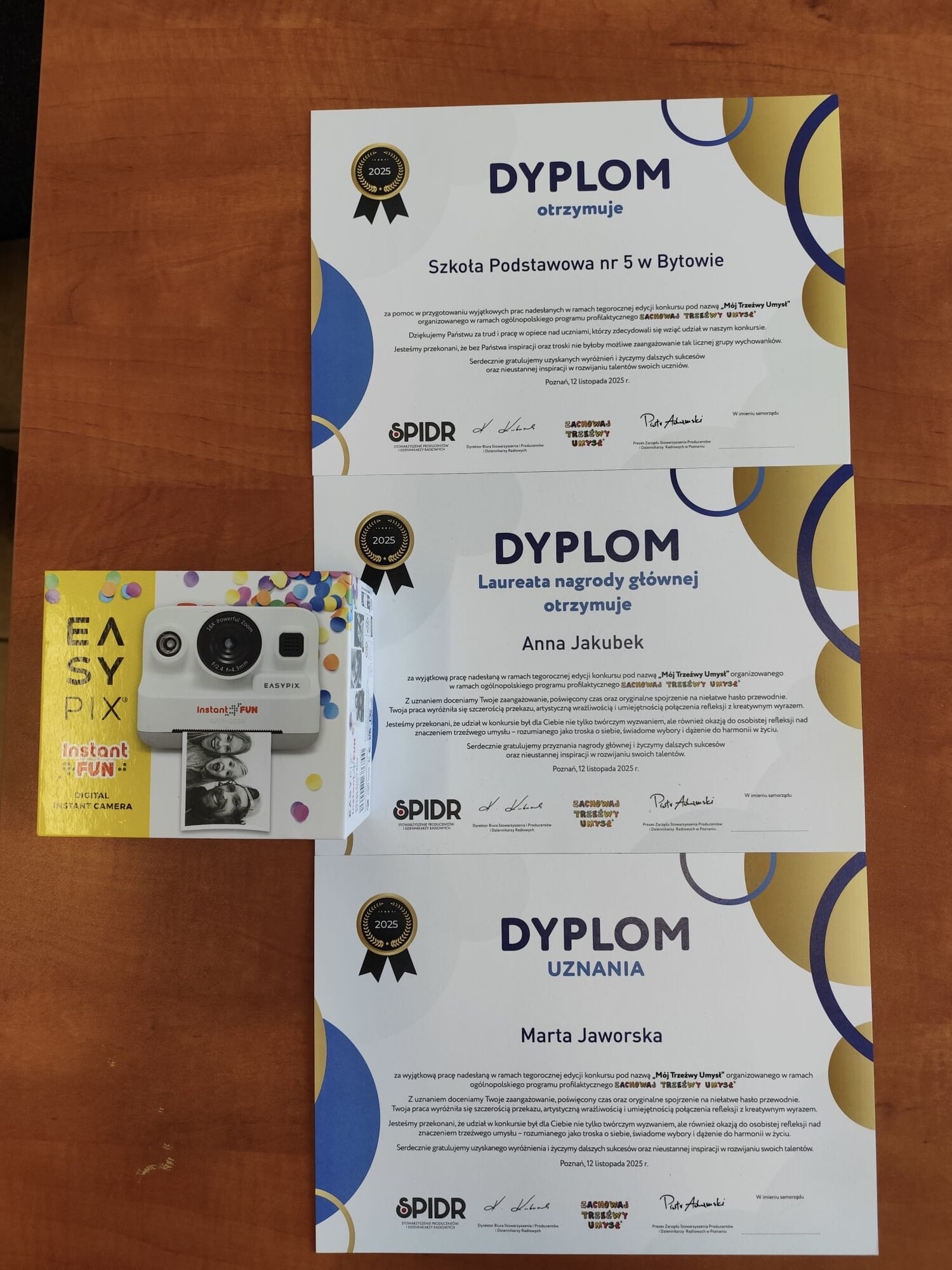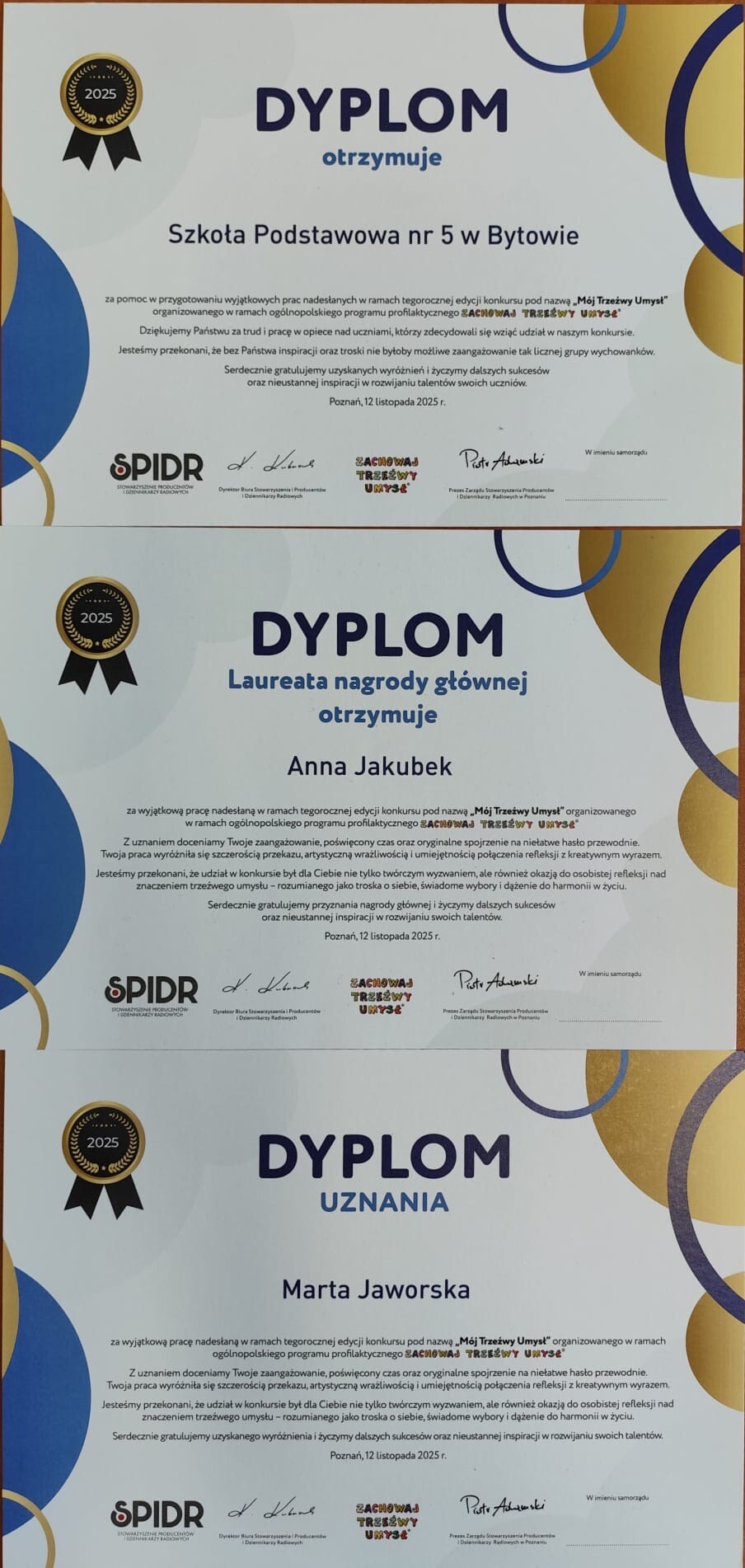 Dyplom uznania przyznano Marcie Jaworskiej, a także naszej szkole – SP 5 za pomoc w przygotowaniu wyjątkowych prac konkursowych oraz za trud i zaangażowanie w opiece nad uczniami, którzy zdecydowali się wziąć udział w konkursie.